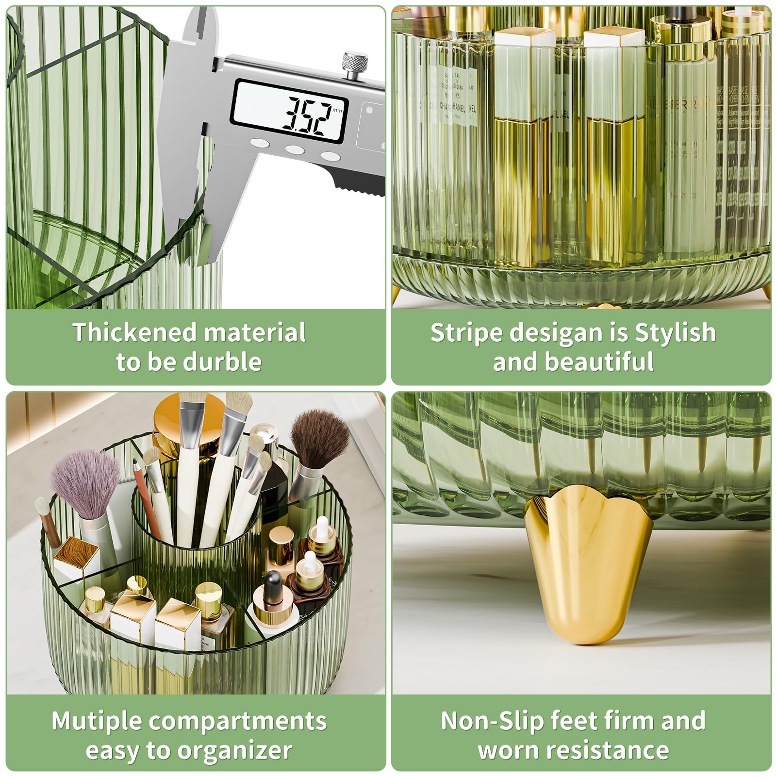 - 【CLEAR AND BEAUTY】Our makeup organizer own a transparent high-quality design, you can clearly catch what you need only by rotating the holder. The combination of clear apperance and gold feet is beautiful and durable which must be the best charming ornament for any countertop, vanity, or dresser