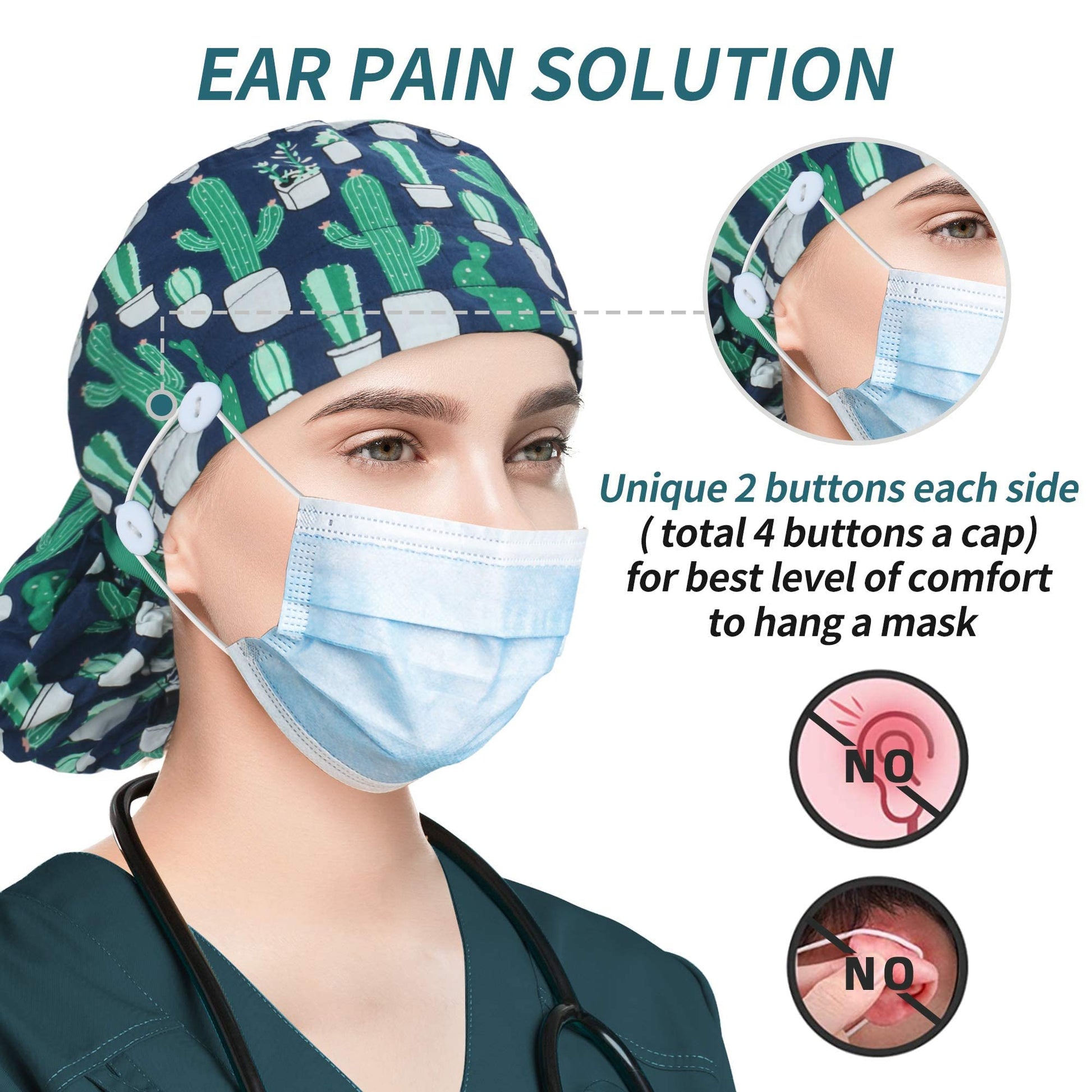 - Unmatched quality: our scrub caps are designed with your comfort in mind. Featuring an added sweatband and two buttons on the sides to secure your mask, plus an adjustable elastic on the back for a perfect fit.