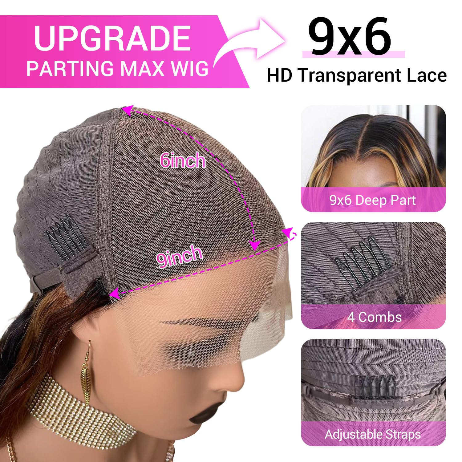 - 1B/30 Colored Wigs Human Hair】:9x6 HD Transparent lace,True to Length,Weight,No Shedding,Tangle Free,Can be Side Part, Middle Part, High Ponytail,Bun,Can Design Any Shape You Like,Stylish Dispersed Highlight Strips Effortlessly Elevate Your Hairstyle.