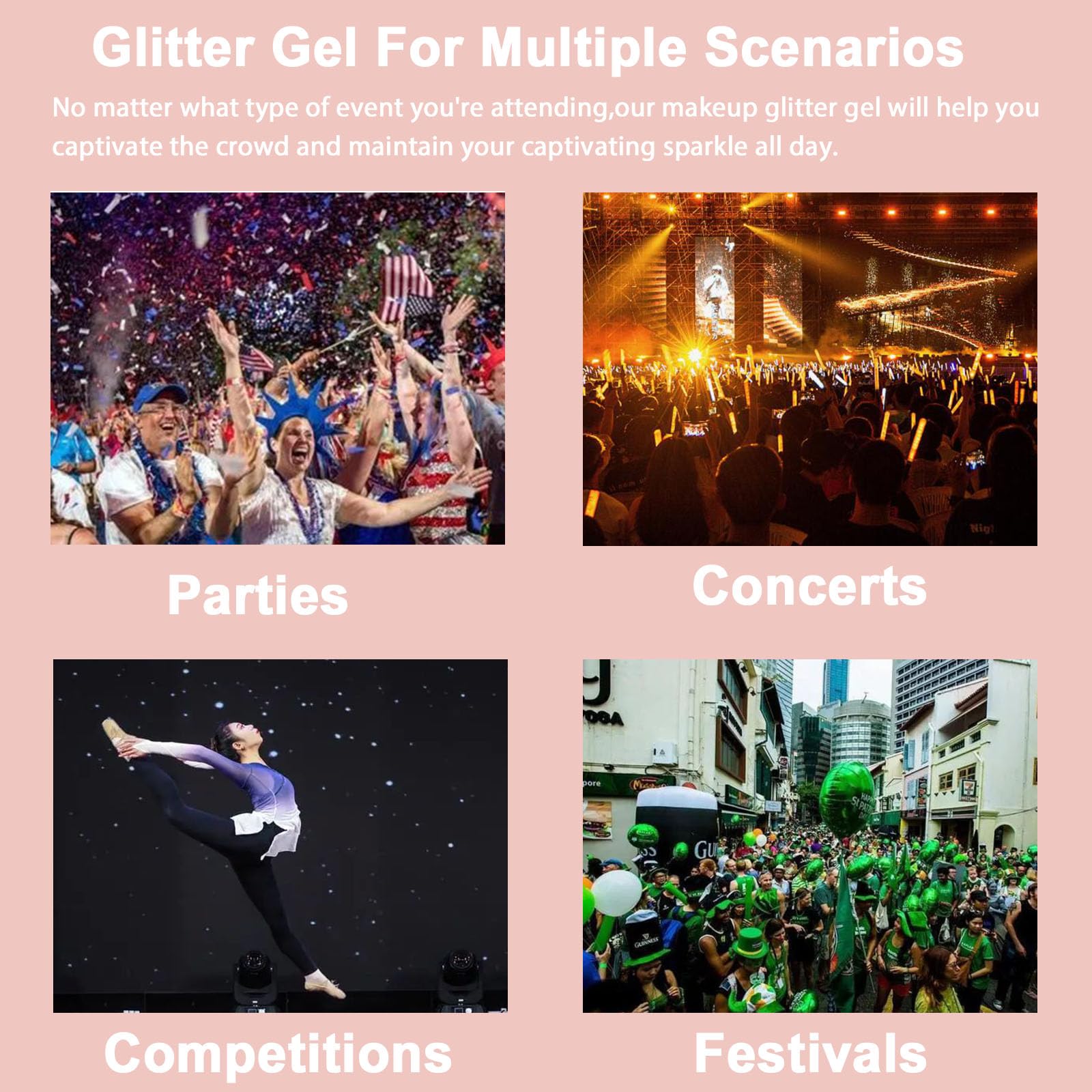 - Sparkle In Vibrant Colors: Choose from our cosmetic glitter gel of 29 vibrant colors. from Mardi Gras, Independence Day, St. Patrick's, Easter, Christmas, to Coachella, you can experience the dazzling appeal of iridescent glitter. Infused with high-intensity pigments and holographic sparkle, our euphoria glitter lotion creates a mesmerizing effect that truly shines. With just one swipe, you can effortlessly apply your makeup and instantly transform into a radiant beauty.